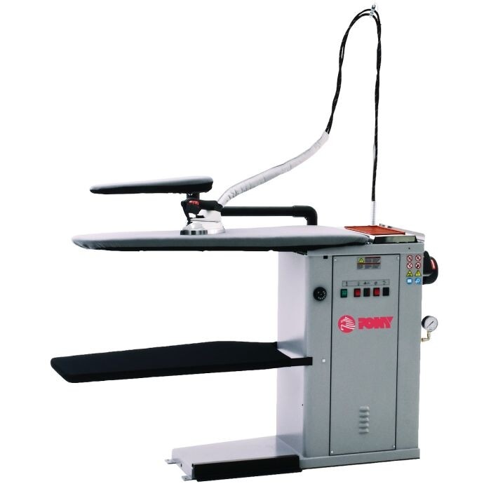 Mesa para passar a ferro industrial bico de pato aquecida eletricamente com caldeira eletrónica embutida de 5 litros.