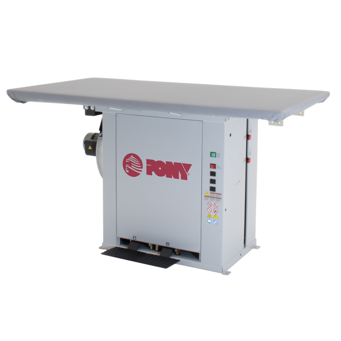 Mesa de passar a ferro indusrial retangular aquecida a vapor, a vácuo e a vapor, pronta para conexão ao vapor central. Disponível com mesa Standard (1400x700 mm) ou Maxi (1600 x 850 mm).