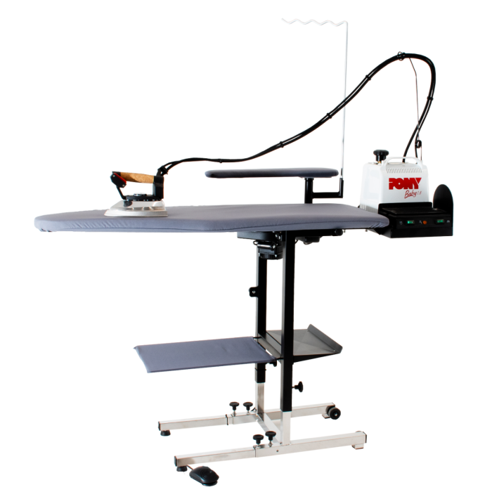 Mesa de passar a ferro industrial bico de pato com ajuste de altura livre de 76 a 107 cm. Pode ser dobrado verticalmente para economizar espaço. Com elemento de aquecimento para a superfície de engomar regulada por termostato. Recomendado em conjunto com uma caldeira a vapor BABY colocada na parte traseira da mesa.