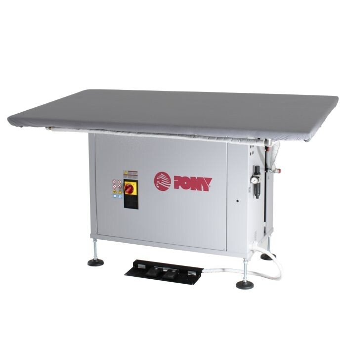 Mesa de passar a ferro industrial retangular aquecida a vapor, a vácuo e a vapor, pronta para conexão ao vapor central. Disponível com mesa Maxi (1600x850 mm) ou Extra Large (1800 x 900 mm). Os modelos SC e SD estão disponíveis com unidade de vácuo embutida ou para conexão ao aspirador central e com caldeira embutida ou para conexão ao vapor central.