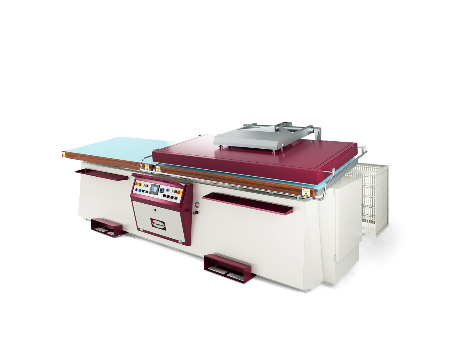 Prensa dupla de vaporização/aspiração com prato superior vaporizador para engomar peças de vestuário de malha