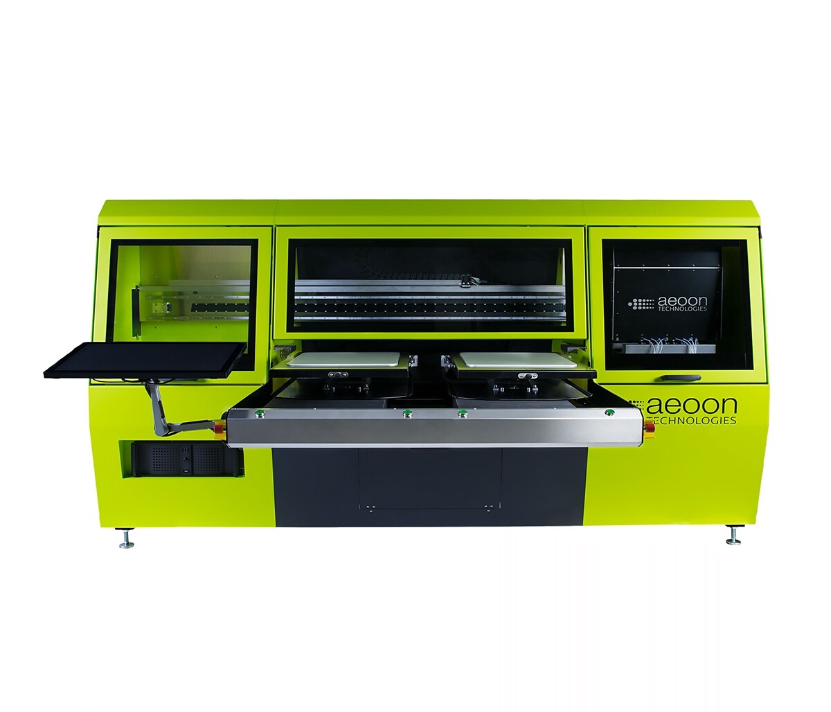 Ploter de impressão directa à peça, disponível com 4(CMYK) ou 8(CMYK duplo, CMYK + 4W) cabeças. 2 eixos com pratos até 50x70cm.