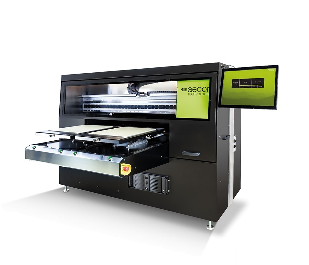 Ploter de impressão directa à peça com 6 cabeças (CMYK+2W) ou 8 cabeças (CMYK+4W).
