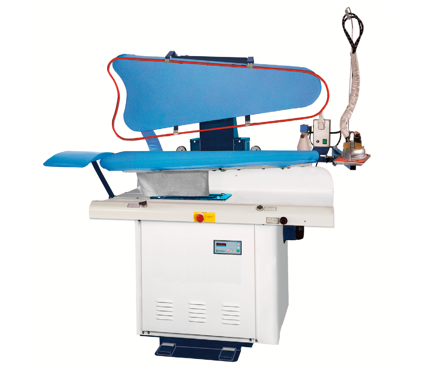 Prensa de passar pneumática especialmente concebida para colarinhos e punhos (disponível com fecho em tesoura ou fecho vertical).