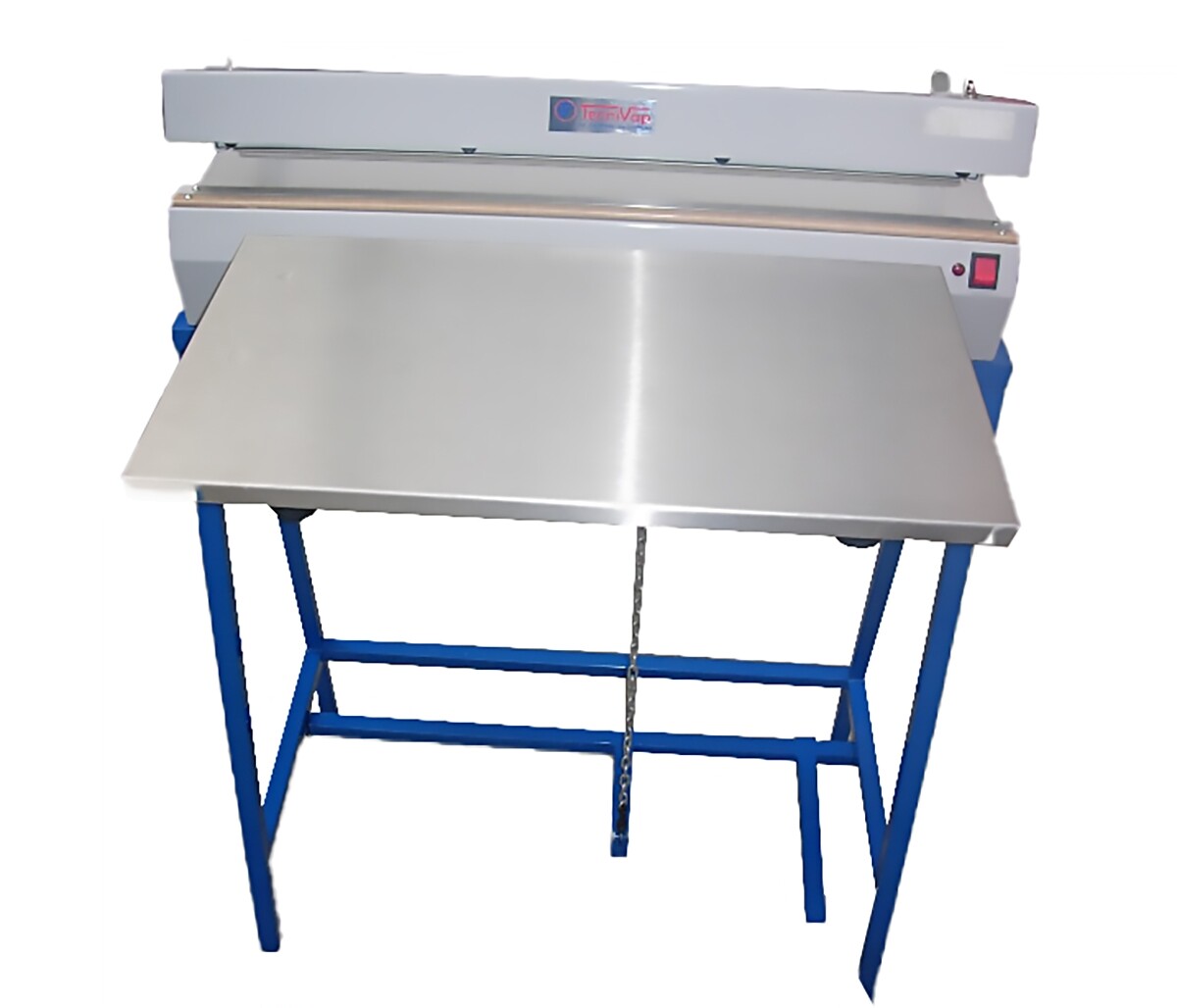 Máquina de soldar sacos manual com tripé e plataforma de apoio amovível. Disponível para sacos com largura de 25cm, 40cm ou 60cm, conforme modelo.