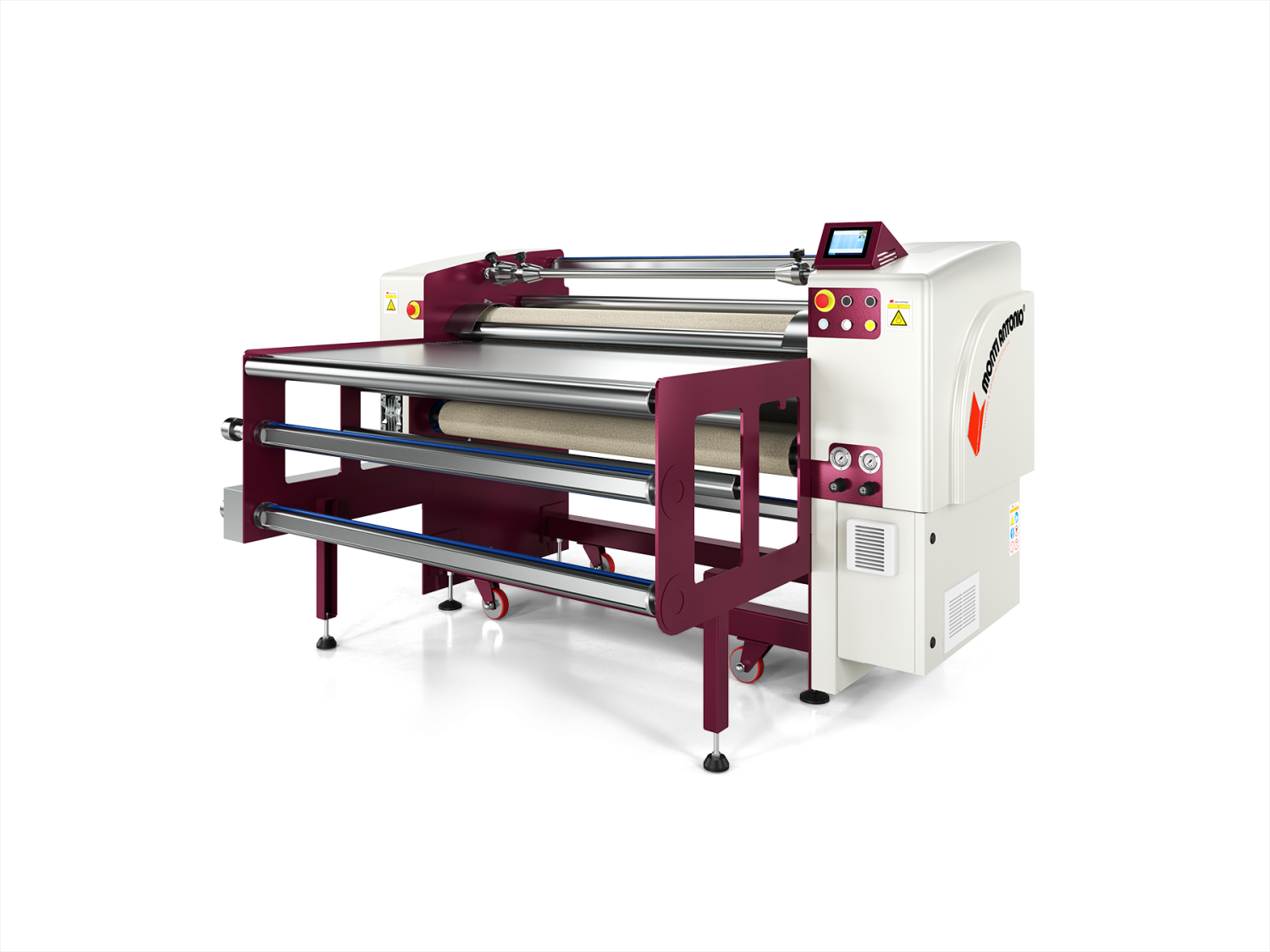 Calandra para sublimação em contínuo e peça a peça com cilindro de 1300mm de largura e 200mm de diâmetro