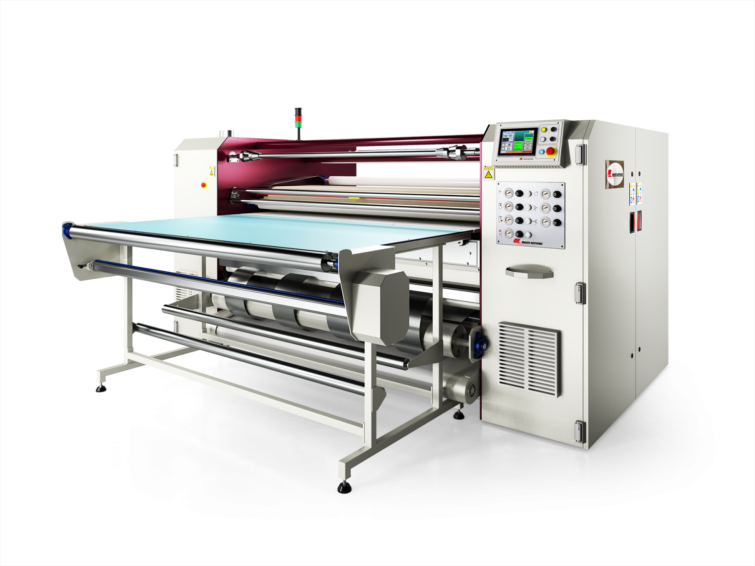 Calandra para sublimação em contínuo e peça a peça com cilindro de 2200mm de largura e 500mm de diâmetro, com tapete de descarga.