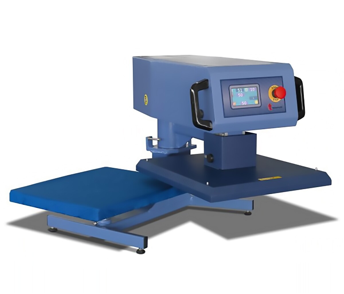 Prensa térmica automática com 1 prato de 50x40cm com abertura lateral. Pressão automática.