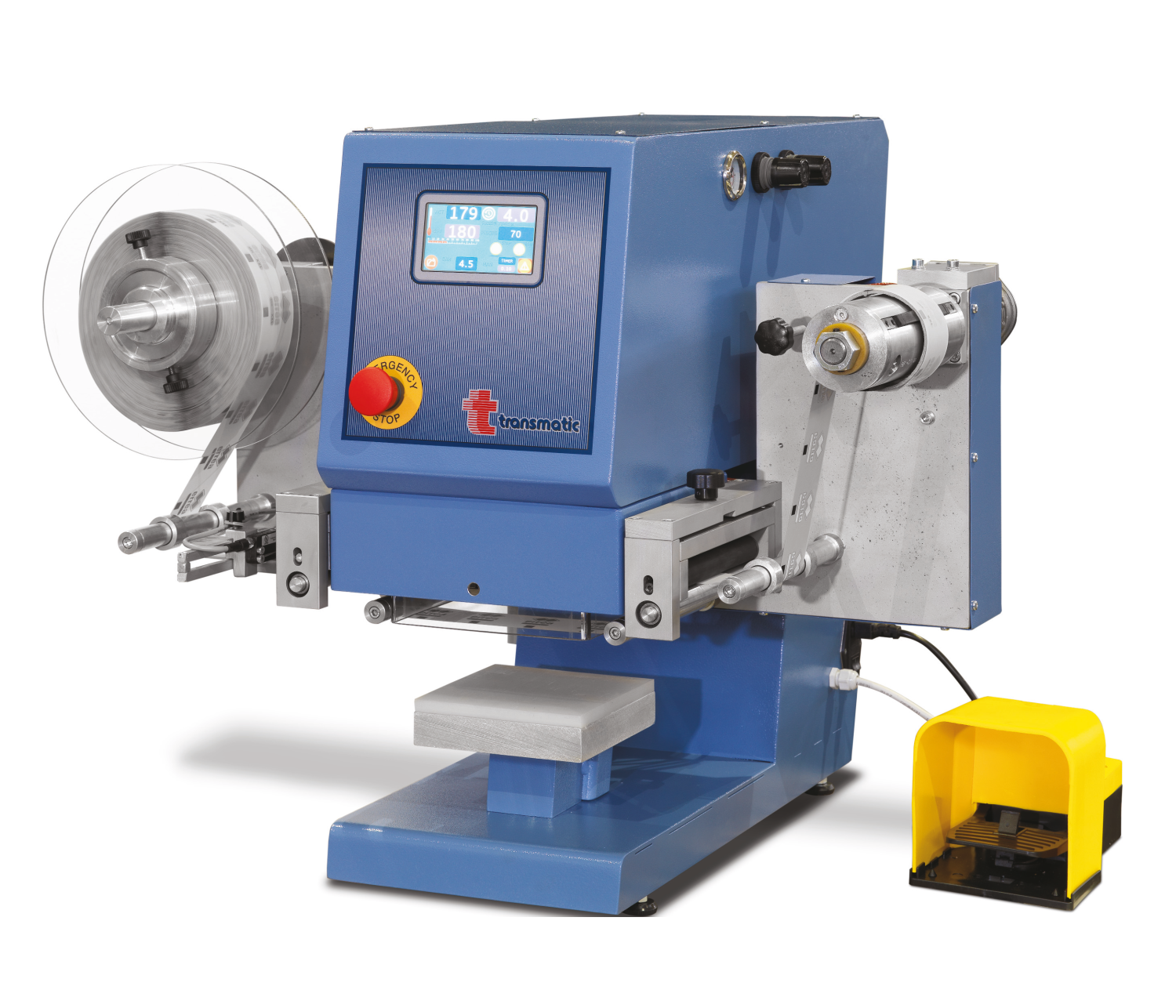 Prensa térmica pneumática automática com 1 prato 15x15cm, especialmente concebida para transfer em rolo.