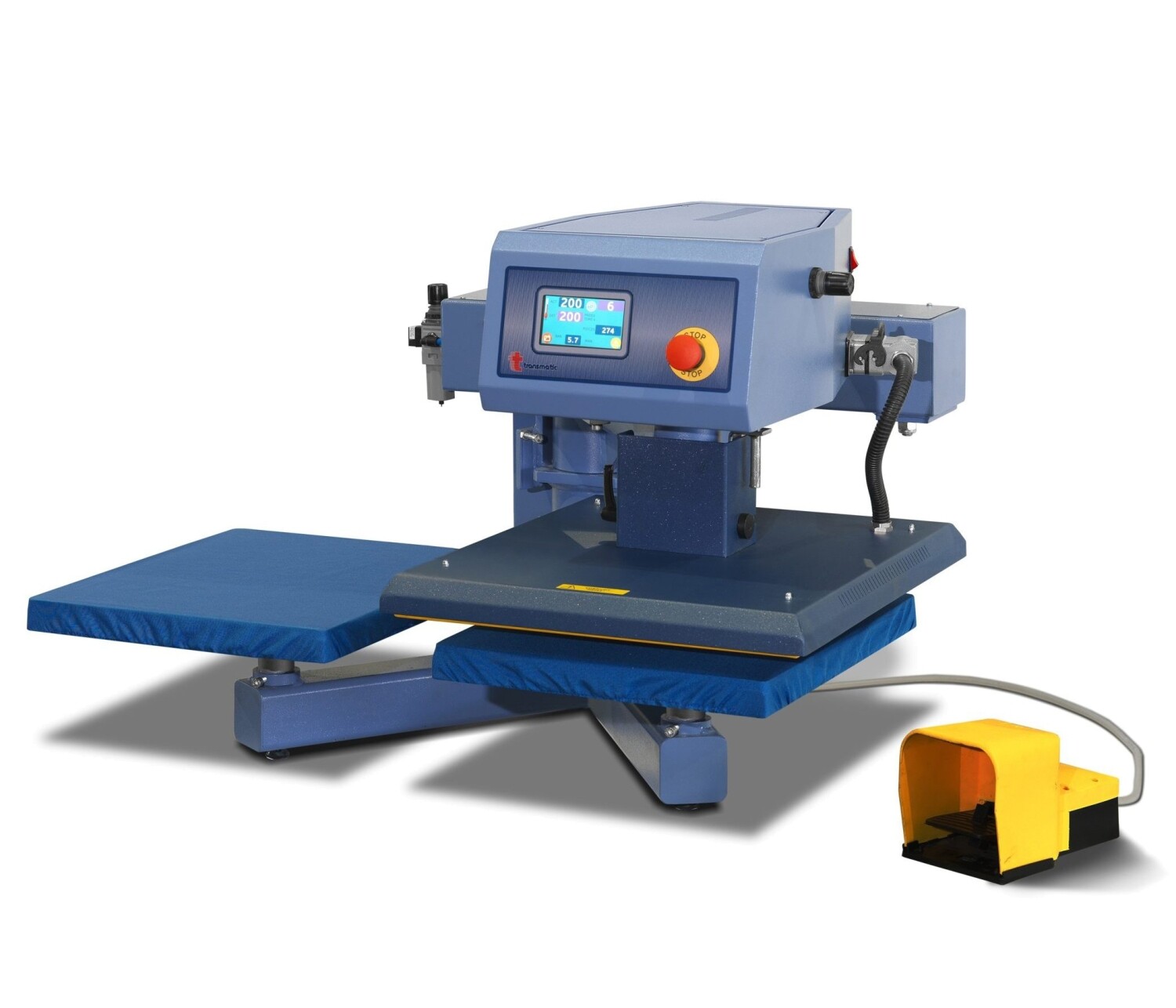 Prensa térmica pneumática automática com 2 pratos de 61x51cm.
