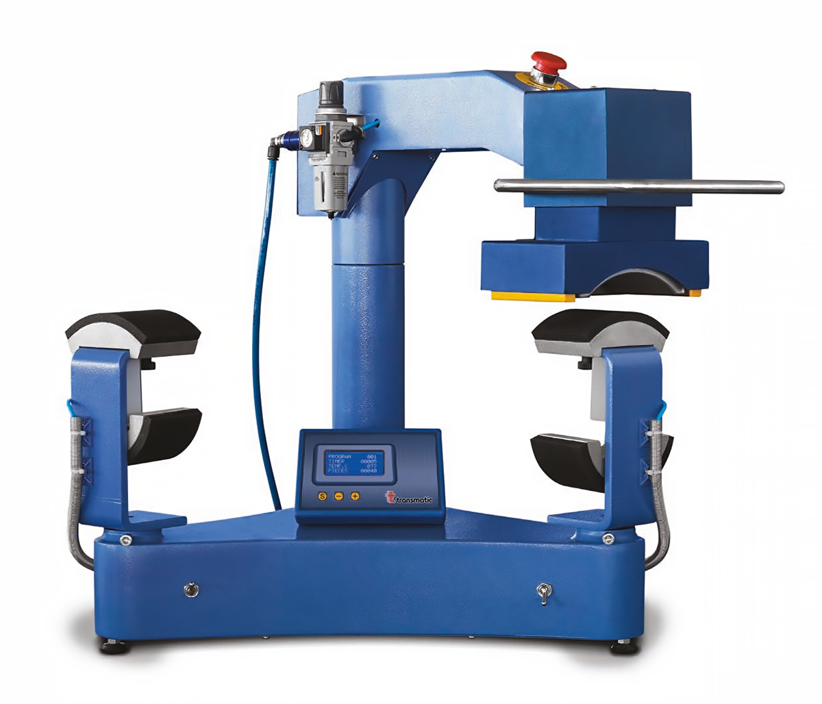 Prensa térmica pneumática semi-automática com 2 pratos, especialmente concebida para bonés.