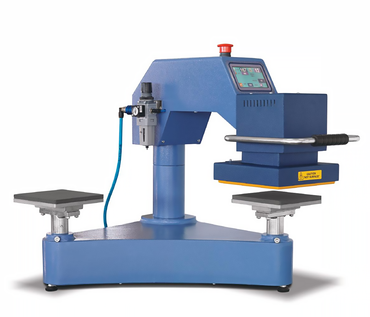Prensa térmica pneumática semi-automática com 2 pratos de 15x15cm.