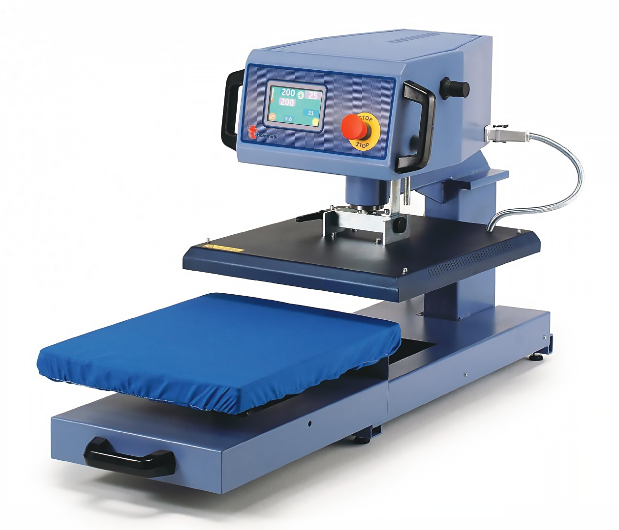 Prensa térmica pneumática semi-automática com 1 prato de 50x40cm com abertura frontal.