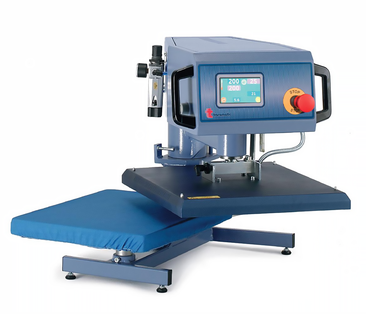 Prensa térmica pneumática semi-automática com 1 prato de 50x40cm com abertura lateral.