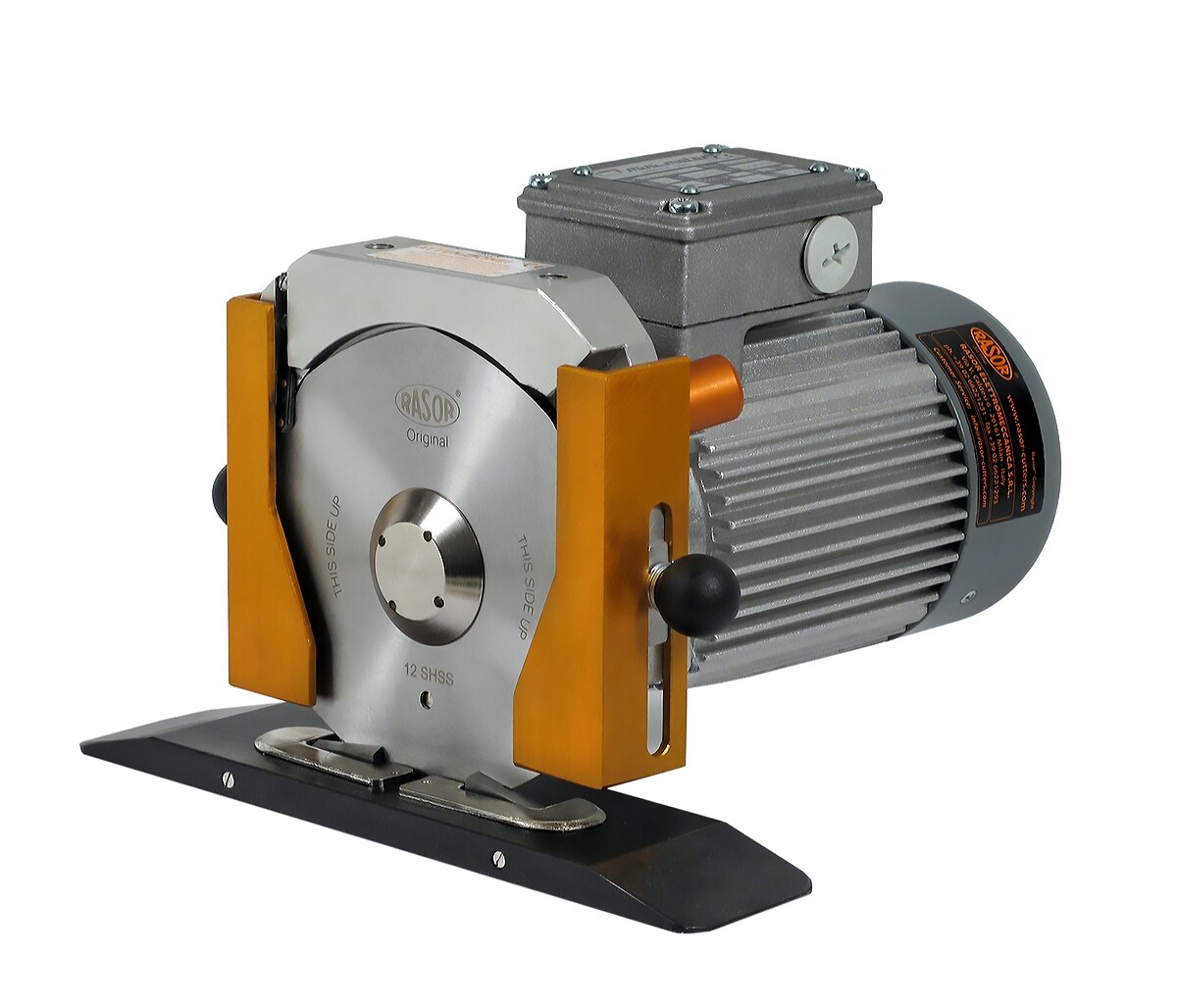 Unidade de corte eléctrica trifásica 180W com lâmina Ø120mm c/ 8 lados (esquerda), 2600 rpm, altura de corte até 50mm.