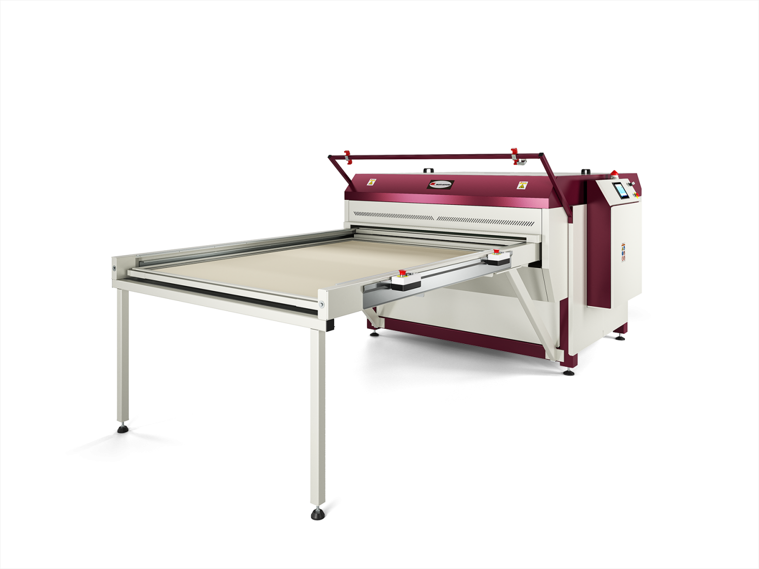 Prensa dupla, hidráulica, para impressão por transferência e colagem, com prato inferior e superior aquecidos.